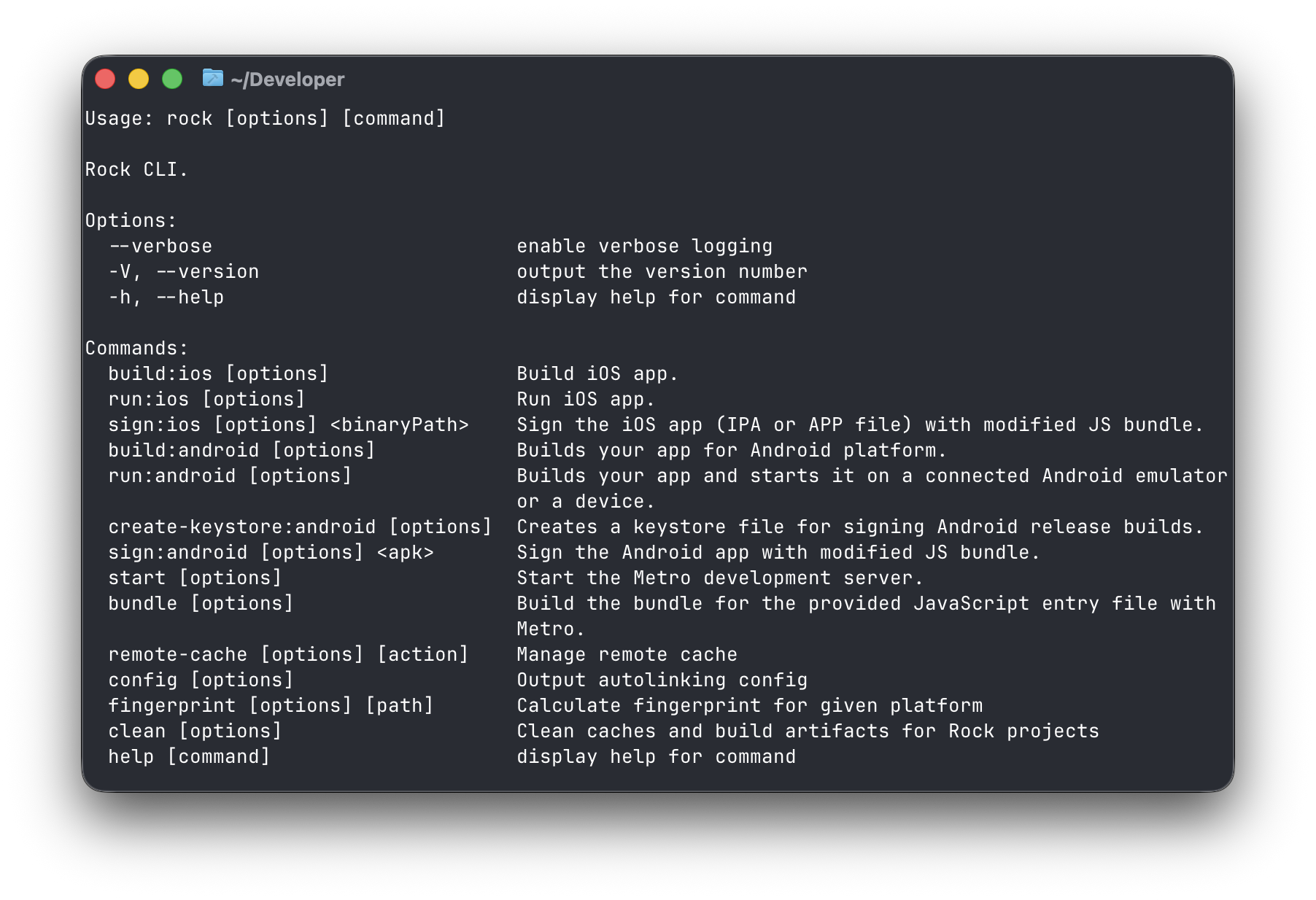 rock bundle OptionsThe bundle command creates an optimized JavaScript bundle for your application, optionally using Hermes bytecode.